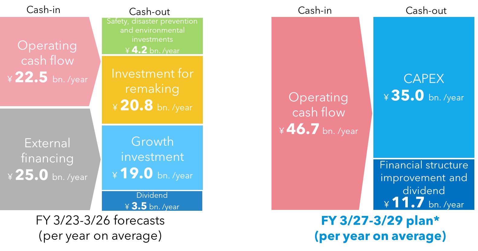Cash flows from operating activities for the 2025 Medium-Term Management Plan are forecasted to be an annual average of ¥22.5 billion, while for FY 3/27 – FY 3/29, they will be increased to ¥46.7 billion.