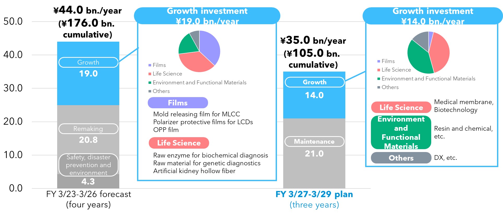 We will imvest aggressively in Life Science and Environmental and Functional Materials within 3 years of FY 3/27 to FY 3/29. Additionaly, inorganic strategies will be flexibly assessed and executed.
