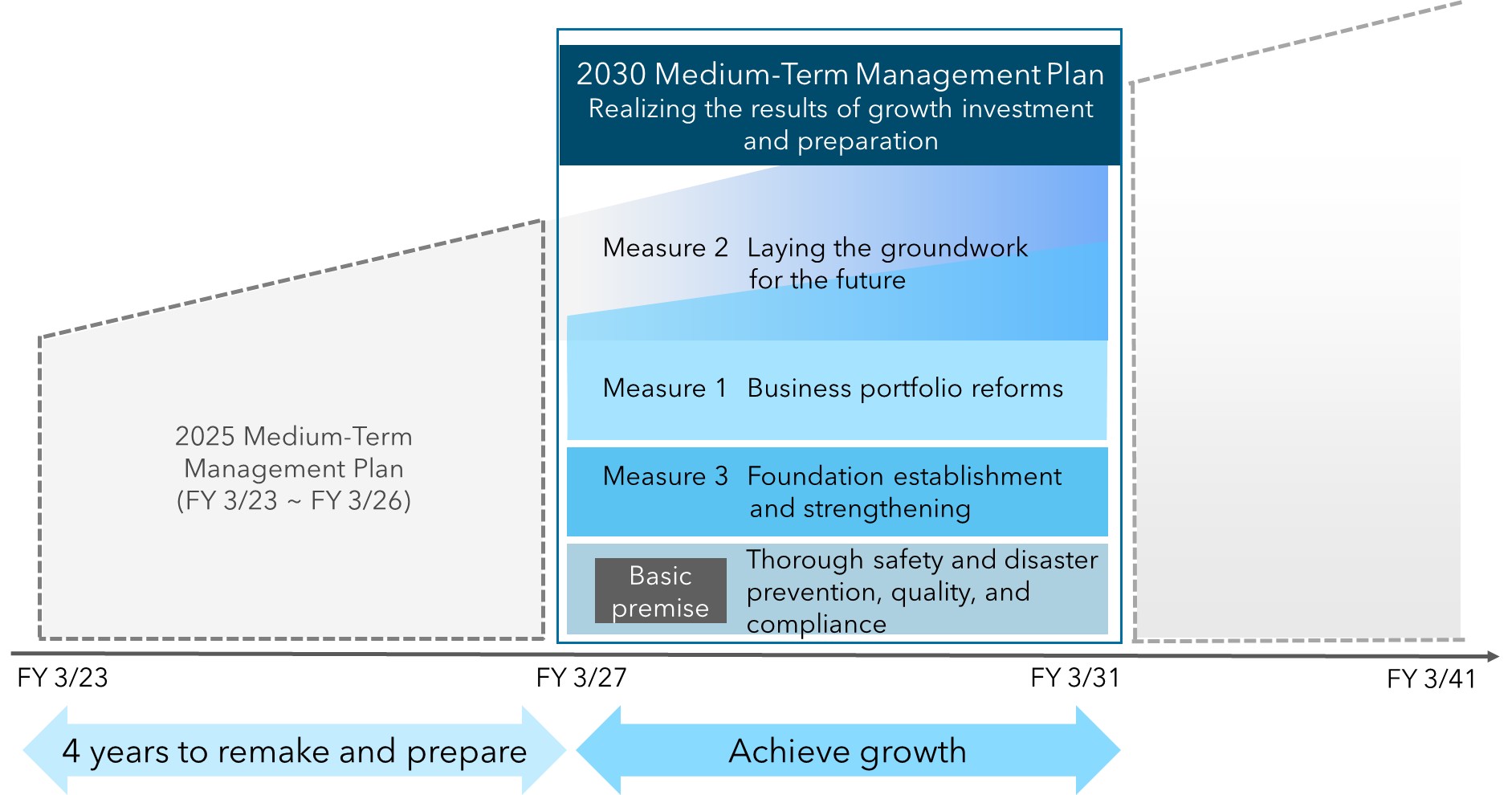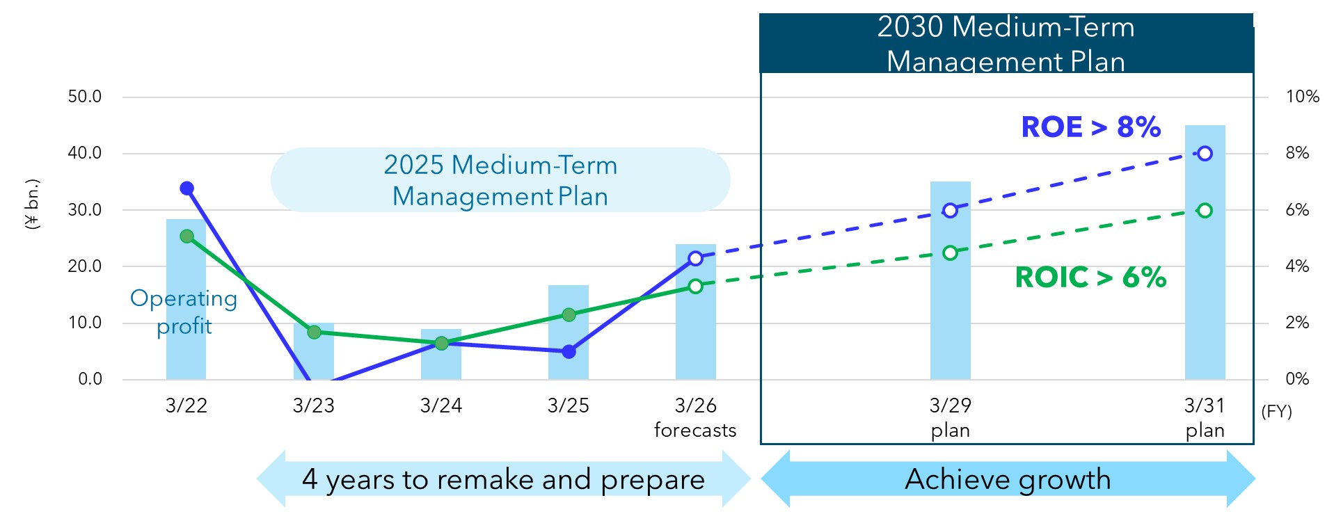 The 2030 Medium-Term Management Plan (FY 3/27 – FY 3/31) is positioned in the latter half of Sustainable Vision 2030, and aims to balance improvement of financial structure and profit growth, as well as attain ROE of over 8% by FY 3/31. Specifically, we will advance the 3 measures of Business portfolio reforms, Laying the groundwork for the future, and Foundation establishment and strengthening on the basic premise of Thorough safety and disaster prevention, quality, and compliance.