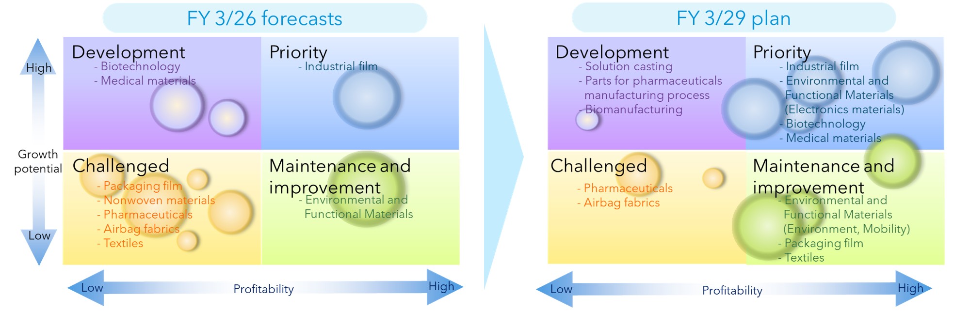We will categorize each business into the four quadrants of Priority businesses, Maintenance and improvement businesses, Development businesses, and Challenged businesses based on the two axes of profitability and growth potential, and conduct business operations according to their respective positions. In FY 3/29, we plan to set Industrial film, Biotechnology, Medical materials, and electronics materials of Environmental and Functional Materials as the businesses positioned as our Priority businesses, and increase the proportion of capital employed for Priority businesses from 27% to over 50%.