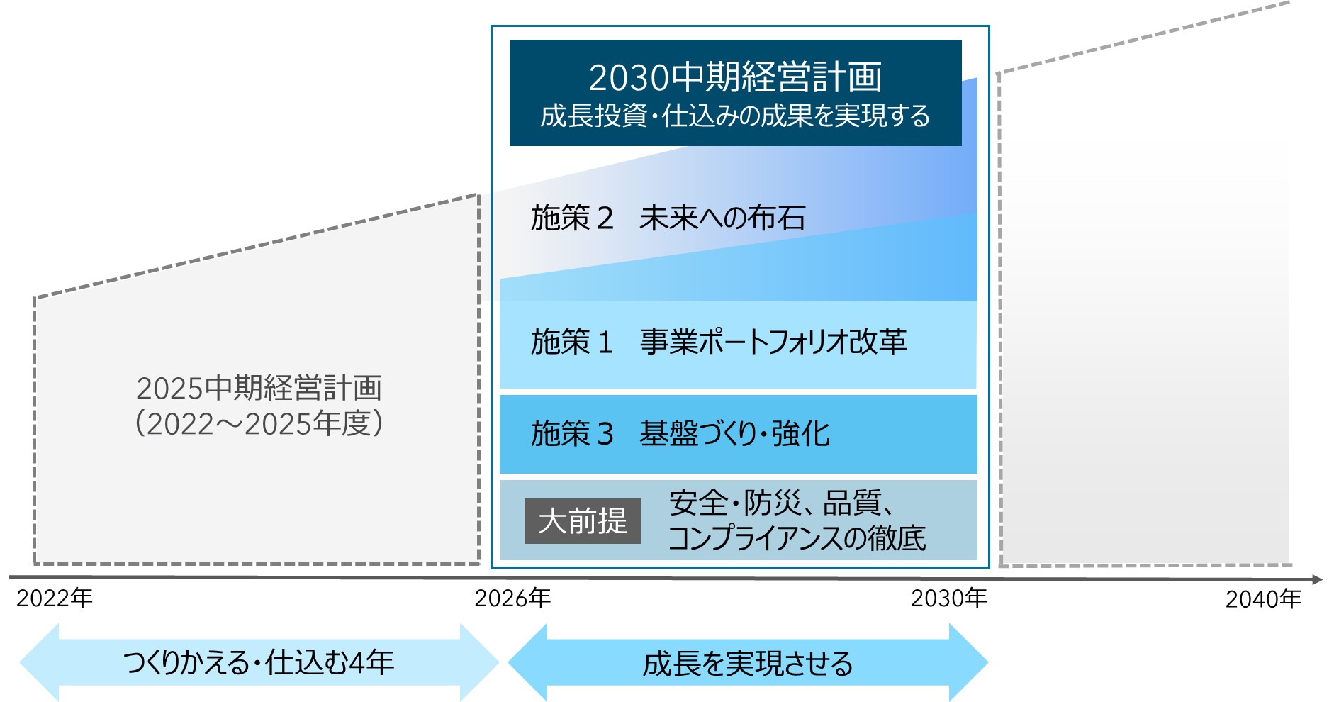「2030中期経営計画(2026~2030年度)」は、「サステナブル・ビジョン2030」の後半と位置づけ、財務体質の改善と利益成長を両立させ、2030年度までにROE8%超を目指します。具体的には、「安全・防災、品質、コンプライアンスの徹底」を大前提とし、「事業ポートフォリオ改革」「未来への布石」「基盤づくり・強化」の3つの施策を進めます。