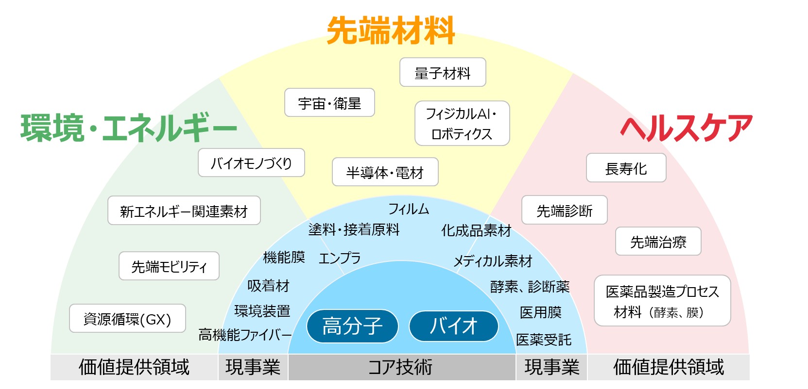 「先端材料」「ヘルスケア」「環境・エネルギー」の価値提供領域の有力テーマに対して資源をシフトしていきます。