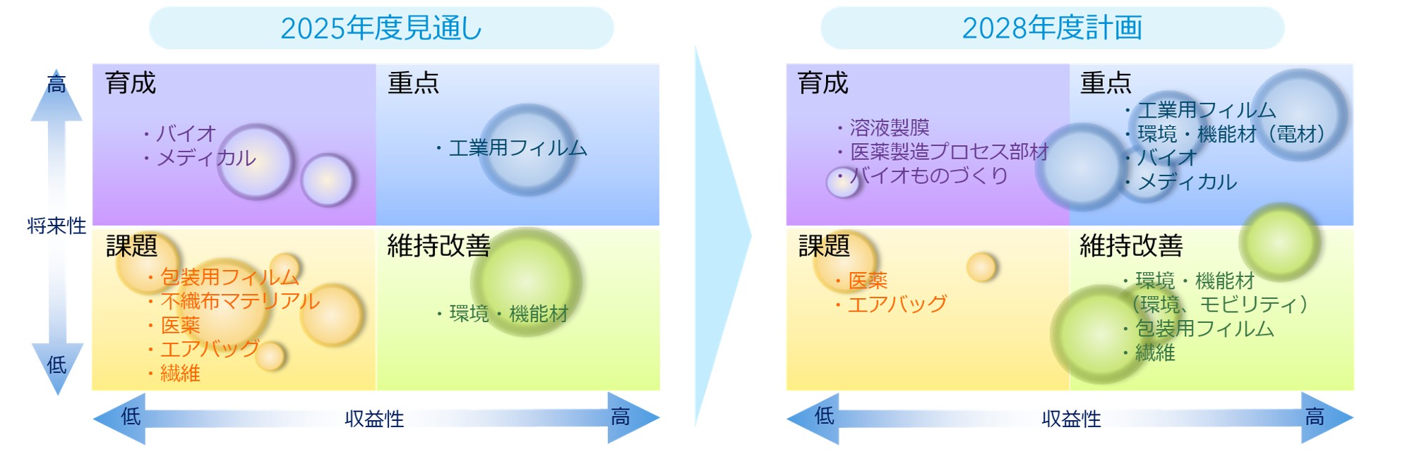 「収益性と将来性」の2軸、「重点・維持改善・育成・課題」の4象限に各事業を層別し、各々の位置づけに応じた事業運営を行います。2028年度には、「重点」に位置づけられる事業を、工業用フィルムに加えて、バイオ、メディカル、環境・機能材の電子材料とし、「重点」事業の使用資本比率を27%から50%超とする計画です。