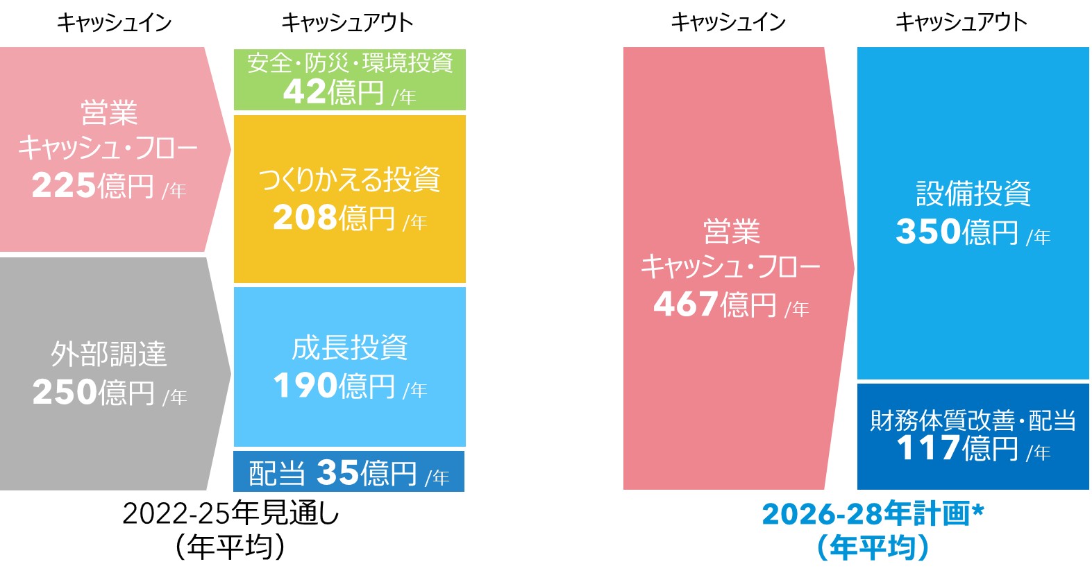 2025中期経営計画の営業キャッシュ・フローは年平均225億円、それに対し2026~2028年度は467億円に拡大する計画です。
