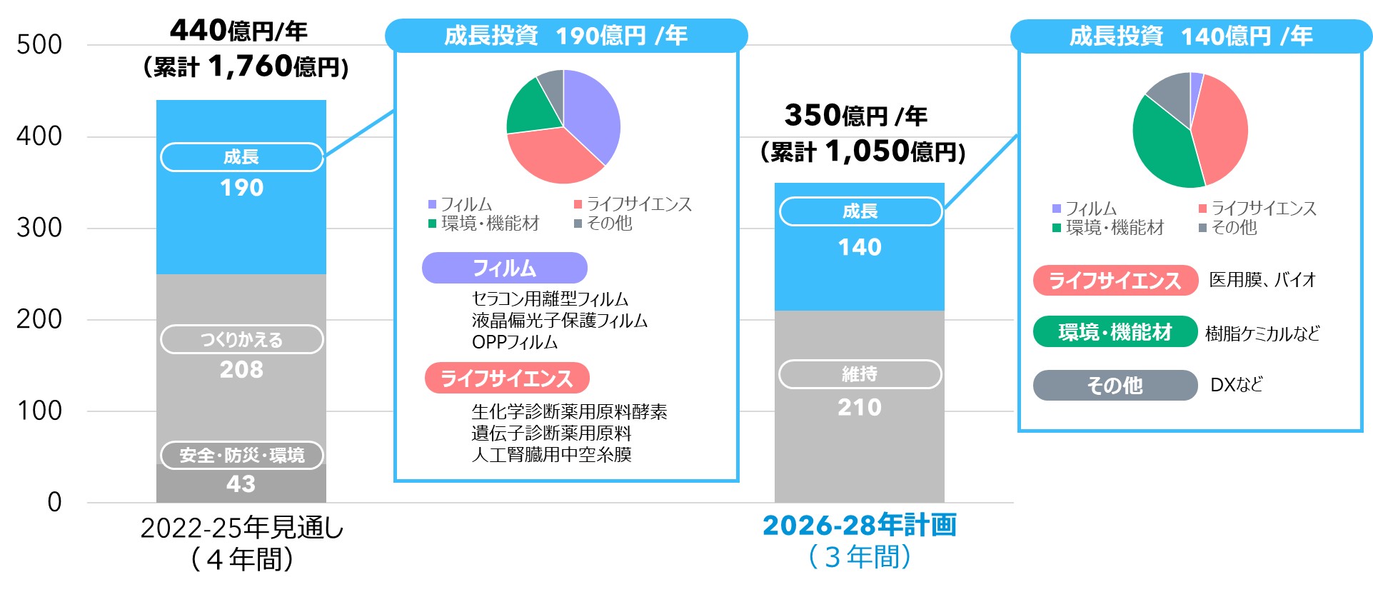 2025中期経営計画の4年間で大型投資はピークアウトし、フィルムの成長投資は一巡しました。2026~2028年度の3年間では、ライフサイエンス、環境・機能材に積極投資していきます。また、インオーガニック施策は機動的に判断、実行します。