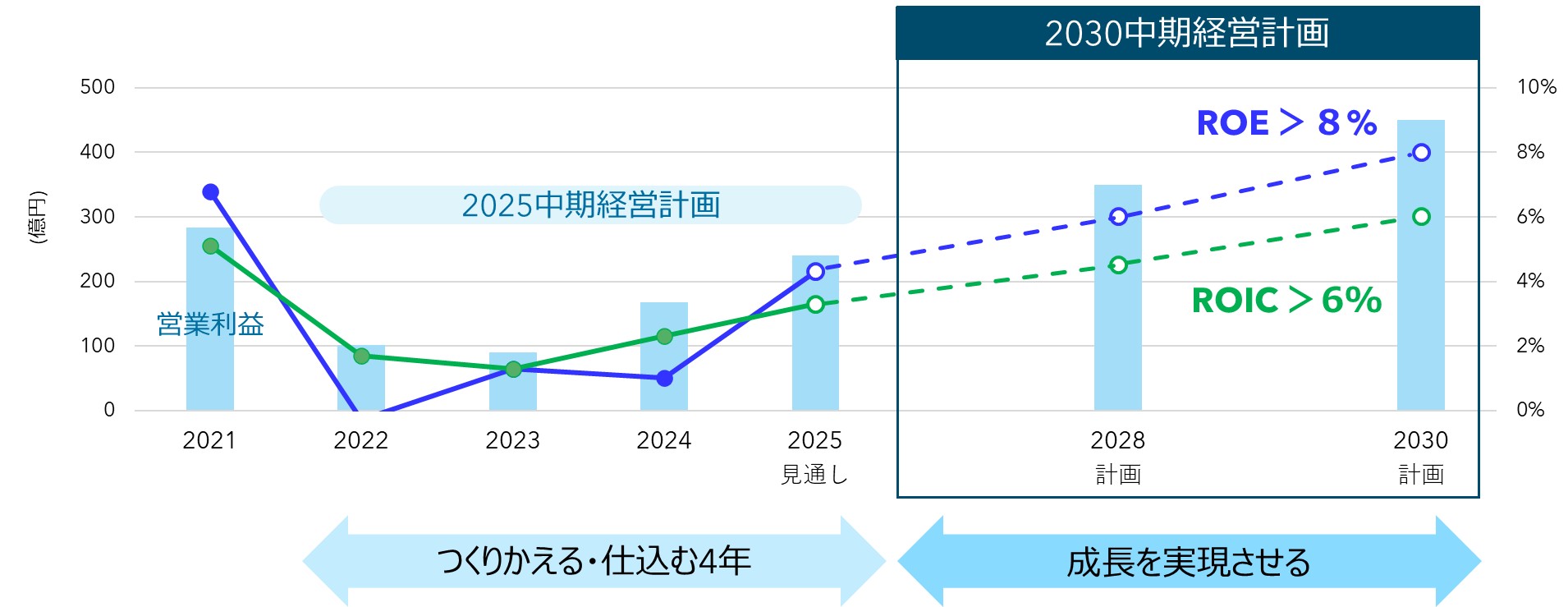 2025中期経営計画(2022~2025年度)は、「サステナブル・ビジョン2030」に掲げる目標達成に向けた通過点として、「つくりかえる・仕込む4年」と位置づけ、取り組んできました。安全・防災、品質などの基盤整備を進め、並行して積極的な設備投資を実行してきましたが、事業ポートフォリオの組替えの遅れ、環境変化への対応遅れ、大型成長投資の立上げ遅れにより、稼ぐ力が低下しました。中期経営計画期間中に、価値に見合ったプライシングの徹底、全社プロジェクトによる経費削減を推進し、後半は回復しましたが、営業利益、ROE、ROICなどの財務指標は目標未達となる見通しです。